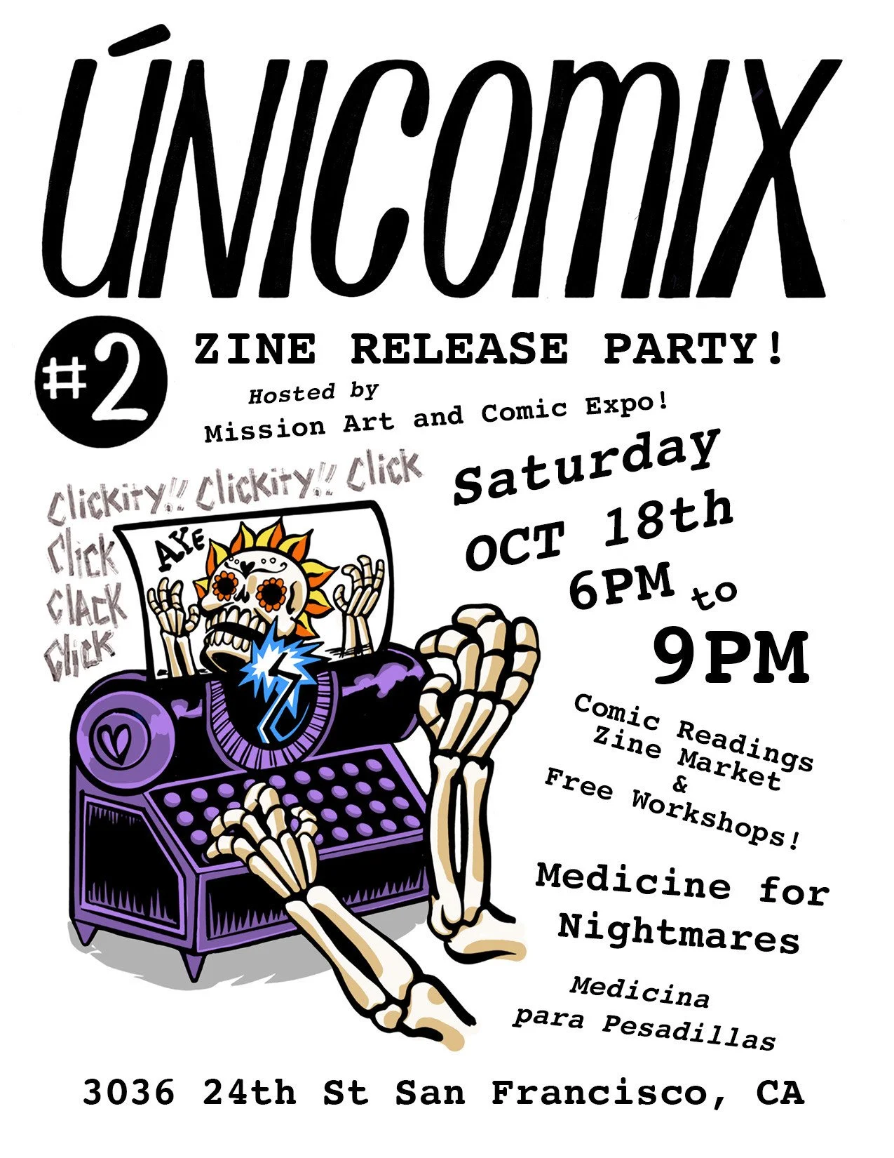 Hosted by the Mission Art and Comic Expo at Medicine for Nightmares bookstore, this event celebrates the next issue of their comic anthology zine UNICOMIX. Their second anthology, UNICOMIX #2 features 23 single page comics inspired by true stories.
