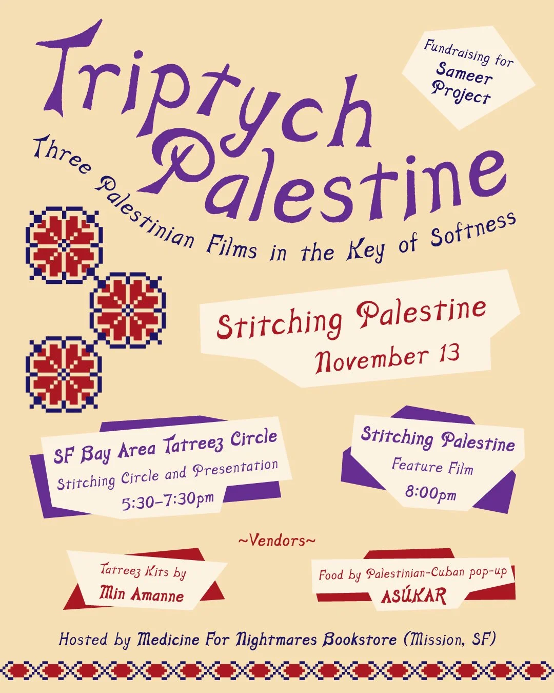 Join us as we present our second installment of TRIPTYCH a new film series highlighting Palestinian films in September, October, and November. TRIPTYCH will be showcasing the subversive power of softness through meditative observation, falling in love, skating, surfing, music, Tatreez, art, and femme relationships. Each screening will be introduced by an artistic presentation that embodies the themes of the film to bring a local perspective. Palestinian-Cuban pop-up ASÚKAR will be outside the bookstore for attendees to purchase food. Organized by Connie Mae Oliver and Andrew Totah fundraising for Sameer Project in collaboration with Black Hole Cinematheque.