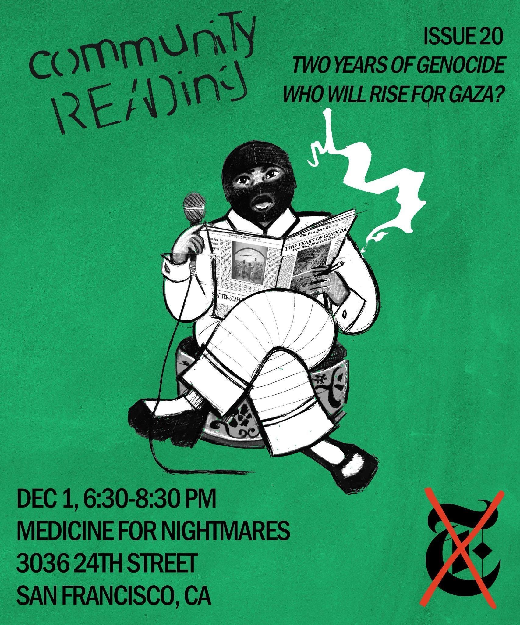 Join us for our next community reading of the Two Year Edition of the New York War Crimes, taking place Monday, December 1 from 6:30-8:30pm at Medicine for Nightmares, 3036 24th St, San Francisco, CA 94110.